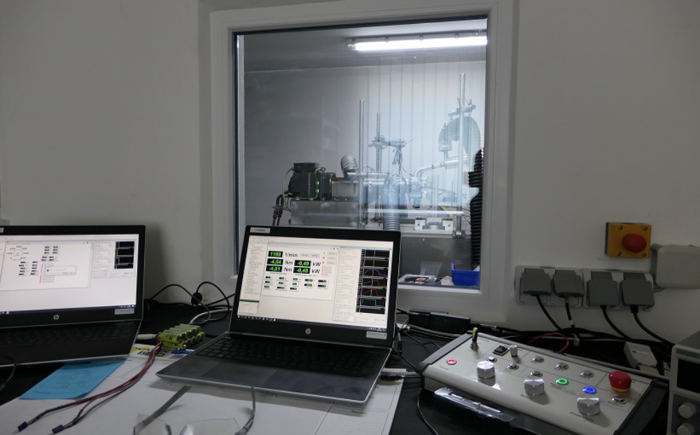 The water-cooled engine test bench is designed for power outputs of up to 16 kW and up to 9000 rpm.
