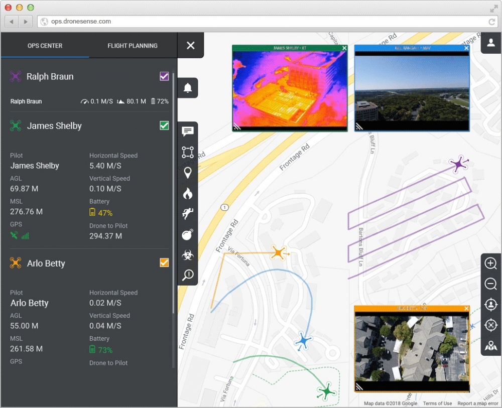 DroneSense brings together everything public safety UAS teams need to effectively manage their drone programs, all on one integrated platform. DroneSense provides drone pilots with an intuitive flight control interface that they can use to fly any mission with any drone in their fleet. Incident commanders gain complete situational awareness with live video streams and telemetry data from drones in the air as well as the ability to collaborate with the pilots on scene from anywhere. Additionally, DroneSense provides program administrators with a complete system of record to keep track of critical data like flight logs, hardware, and personnel.