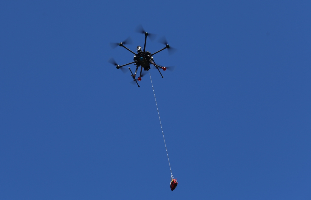 The the AED is lowered to the ground while the drone remains hovering at 30 metres altitude. Photo: Andreas Claesson