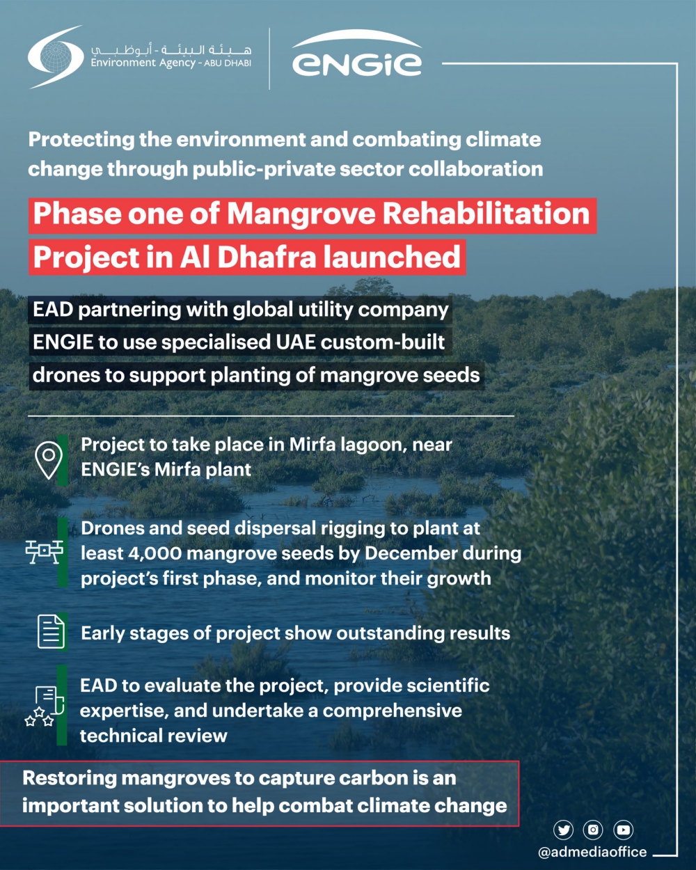 The Environment Agency – Abu Dhabi (EAD) is partnering with the global utility company ENGIE who is sponsoring the launch of the first phase of the “Blue Carbon” Environmental and Social Responsibility project that uses drone technology to help in rehabilitating areas of Abu Dhabi’s mangrove habitats.