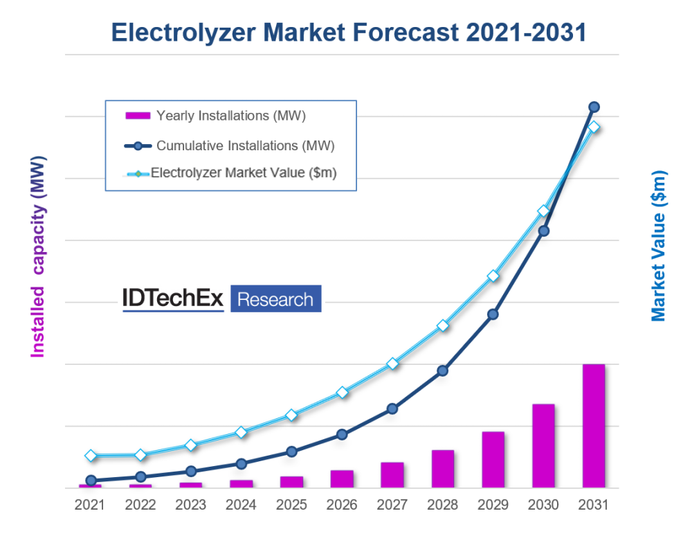 Therefore, IDTechEx investigated this fast-growing market, showing the outcome of their research in the new report “Green Hydrogen Production: Electrolyzer Markets 2021-2031”.