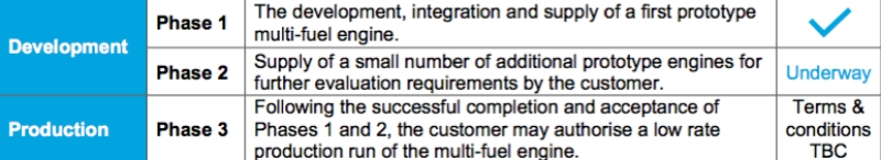 The initial contract and Phase 1 of the MoU was for the development, integration and supply of an engine system for evaluation and acceptance by the customer.