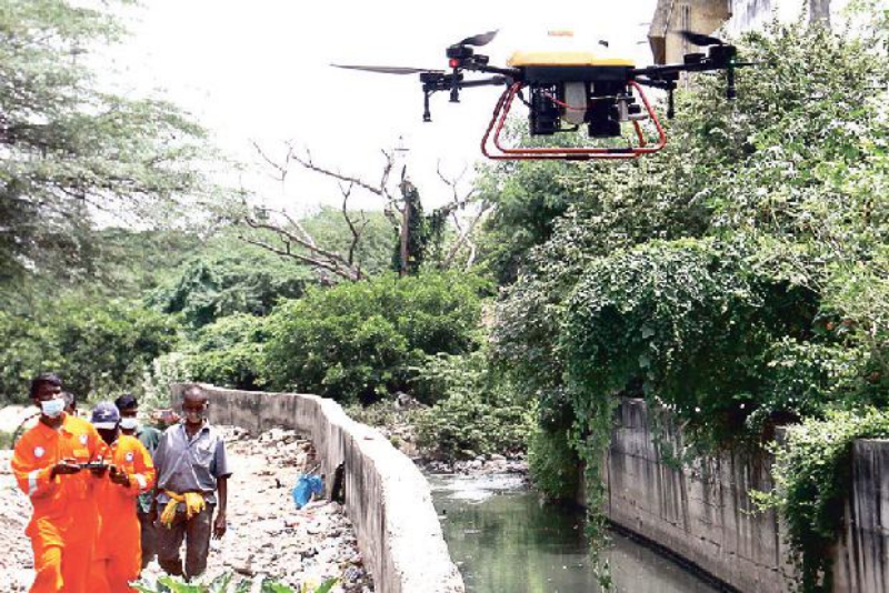 The Greater Chennai Corporation started using drones to fight the mosquito menace. The civic body has taken three drones on rent. The drone is operated by trained pilots sent by the Anna University. The drones are 45 kg in weight and have two tanks. One tank is loaded with three litres of petrol and the other with 10 kg of larvicide.