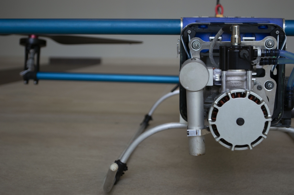 The HAMR utilizes a series hybrid gas-electric propulsion system that incorporates an electronic fuel injected and computer-controlled 35cc single-piston engine driving an integrated generator producing up to 2000W to power six independent brushless DC electric motors and a backup battery. This configuration allows for up to 3.5 hours of flight time, six times longer than a conventional battery-powered multirotor aircraft. Multiple redundant systems, remote engine starting, and onboard batteries ensure the aircraft can operate with a high margin of safety. In the event of an engine failure or an electric motor failure, the craft can abort and land safely.