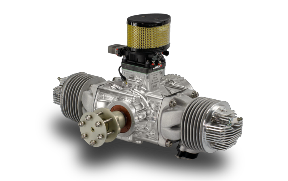 The Suter TOA288 is a twin cylinder, horizontal opposed, air cooled, two cycle engine, utilizing fuel injection, an advanced electronic engine management system and a 1kW starter/generator. Displacement is 288cm3. Power: 17.5kW (24HP) @6500rpm. The engine was a design collaboration between CAE GmbH and Suter Industries combining CAE’s 25 years of manned & unmanned 2-stroke engine experience with Suter’s over 25 years of 2-stroke motorcycle racing design & manufacturing experience.
