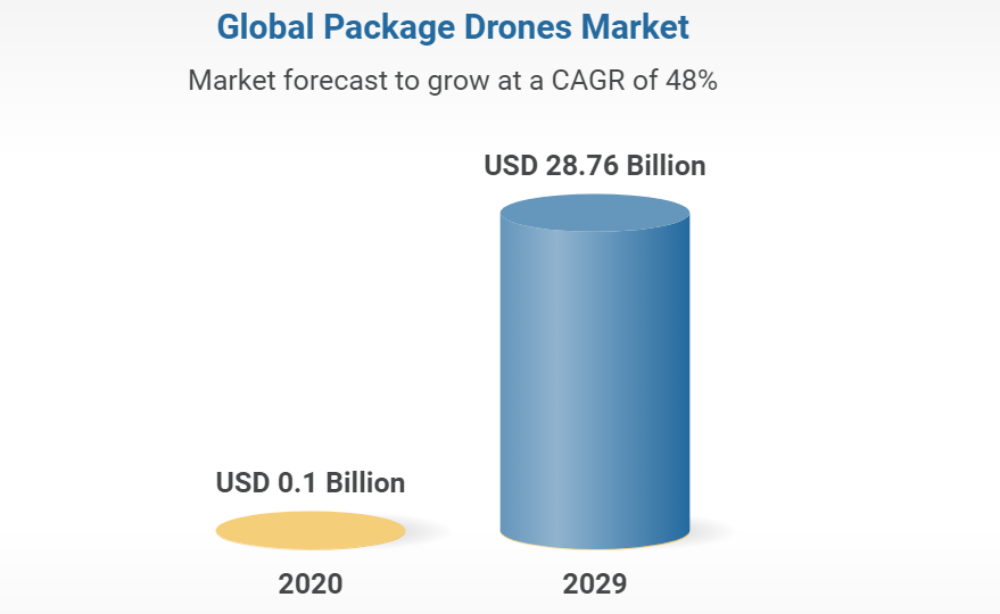 The “Global Package Drones – Market and Technology Forecast to 2029” report finds that the market is expected to grow with a CAGR of 48% between the forecast period (2021-2029). The market is poised to attain a value of USD 28.76 Billion by the year 2029.