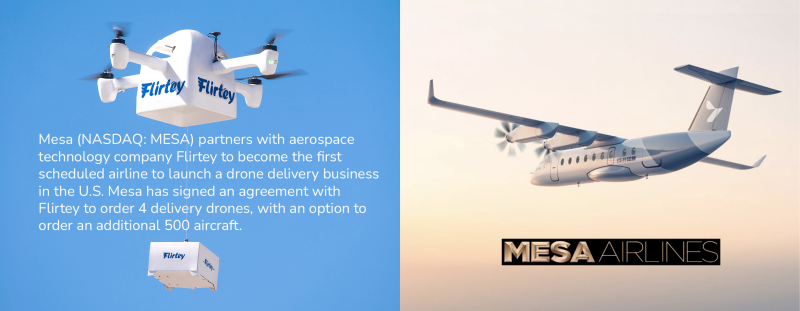 Mesa Air Group, Inc. has signed an agreement with aerospace technology company Flirtey to order 4 delivery drones, with an option to order an additional 500 aircraft. The agreement marks Mesa becoming the first scheduled airline to launch drone delivery in the U.S.