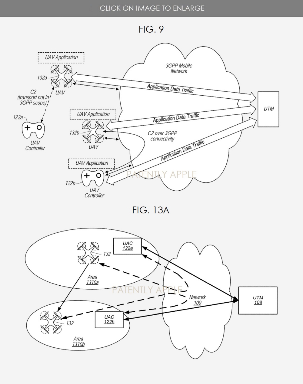 Apple’s patent FIG. 9 below FIG. 9 illustrates an example (and simplified) block diagram of unmanned aerial system (UAS). As shown, the example UAS includes one or more unmanned aerial vehicles (UAVs), a first UAV 132a and a second UAV 132b. The first UAV 132a may be controlled by a first UAV controller 122a operated by a user, and one or both of the first and second UAVs 132a and 132b may be controlled by a second UAV controller 122b operated by a user. The controllers 122a and 122b may transmit command and control (C2) signals to the UAV’s to control their operation, e.g., to control their movement. Example C2 signals include signals to steer the UAV’s, to move the UAV up or down, to adjust the speed of the UAV’s, etc.