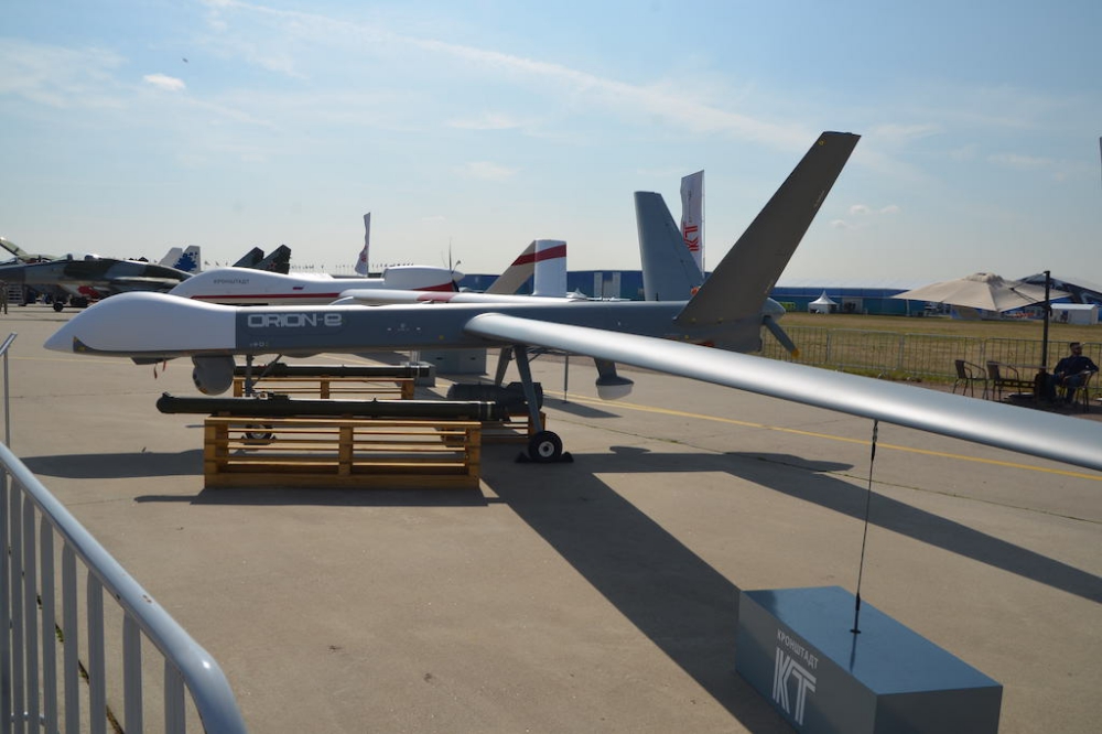 Developed under the Inokhodets project, the version for the Russian armed services officially went into service last year. It differs from the exportable Orion-E on display in that it carries a larger inventory of air-launched munitions and the ability to operate as an element in the network-centric warfare system.