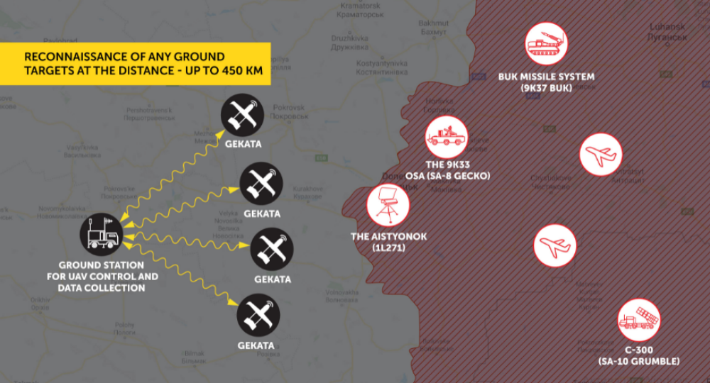 The system comprises eight Ukrspecsystems PD-2 drones — four active and four spares — and a ground control station. Each drone carries with it an Infozakhist radio technical intelligence box suspended with the aircraft’s body tracking “signal pulses from the radar stations, electronic warfare support measures, anti-craft warfare, and airplanes.”