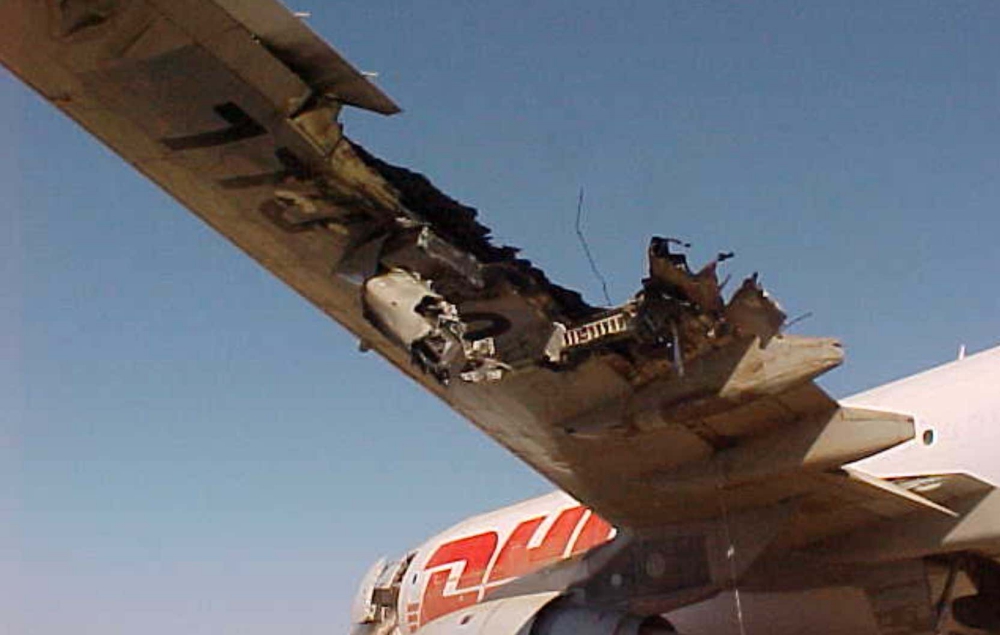 Despite a severely damaged left wing and a total loss of hydraulic control, the three-man crew was able to return to Baghdad and land the aircraft, controlling it primarily by varying engine thrust.