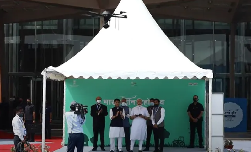 Photo:Indian Prime Minister Narendra Modi during the inauguration of Bharat Drone Mahotsav 2022 — India’s biggest drone festival, at Delhi’s Pragati Maidan on Friday, May 27, 2022. Credit: PTI