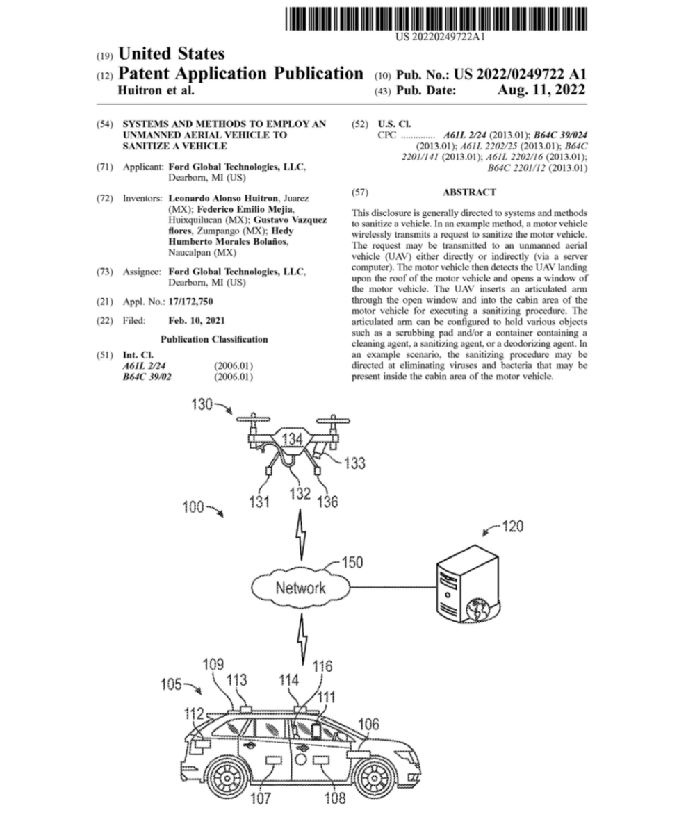Ford Motor Company has filed a patent for an unmanned aerial vehicle sanitation system. The patent was filed on February 10th, 2021, published on August 11th, 2022, and assigned serial number 0249722.