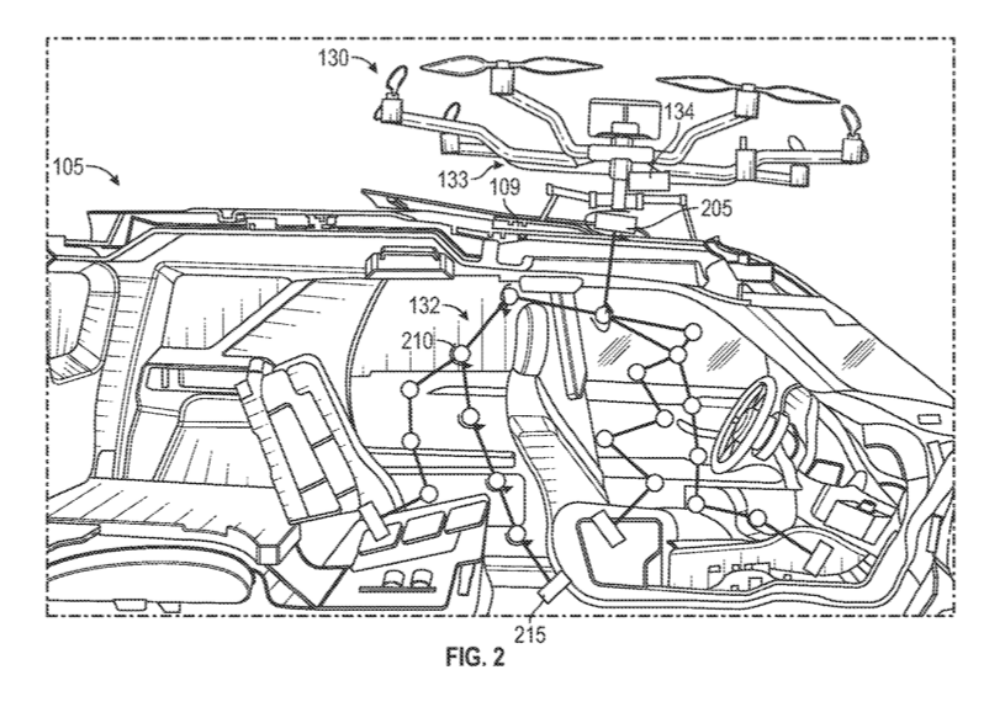 The patent notes that a vehicle would be able to send a wireless signal to this aerial machine indicating that it needs to be sanitized, at which point the unmanned device could land on that vehicle’s roof, open a window, and insert an articulated “arm” into the vehicle. The arm could be configured to hold a number of different things, including subbing pads or containers that dispense sanitizer or cleaner, at which point it could ensure that there are no viruses or bacteria present in the vehicle.
