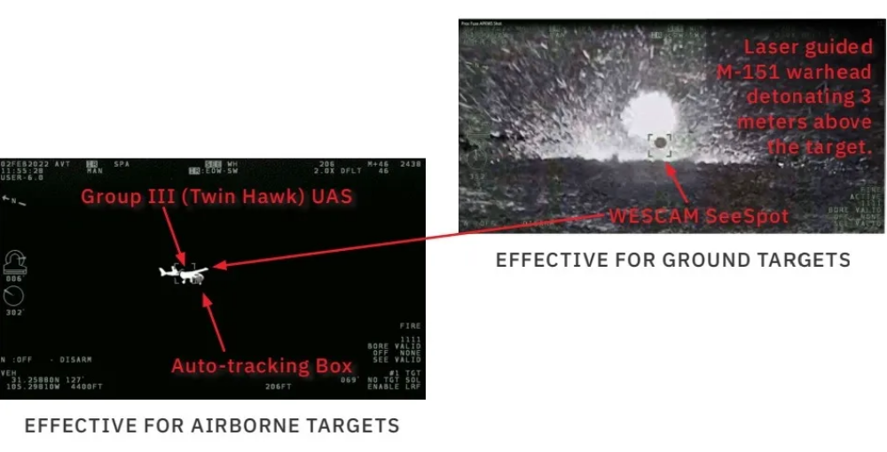The APKWS configuration allows existing warheads from the Hydra 70 system to be used without the need for a laser seeker in the missile nose. An APKWS-equipped rocket was fitted with a proximity fuze and destroyed a Class 2 UAS. The proximity fuze enables it to intercept UAS at a lower cost than other methods, and due to the rocket’s laser guidance that activates on launch, it does not require locking on to the target before launch.