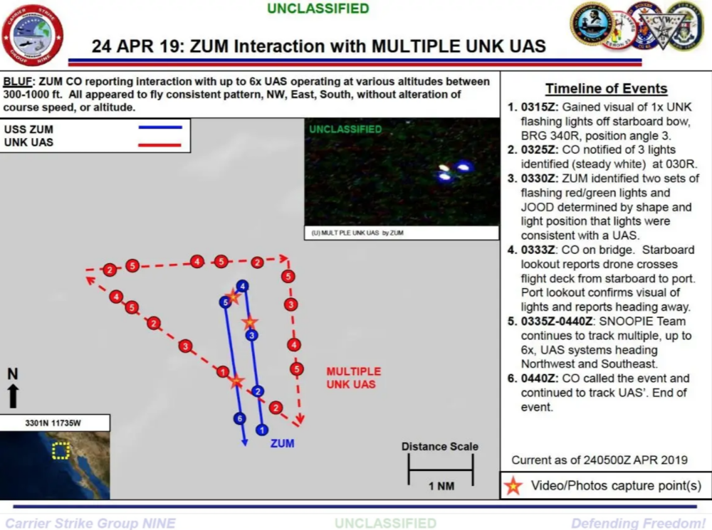 The incident occurred at approximately 8:30 PM Pacific Time on April 24th 2019, around 17 nautical miles from the Marine Corps base at Camp Pendleton in international waters. During the event, the USS Zumwalt reported that as many as six unknown unmanned aerial systems (UAS) were seen operating nearby at altitudes ranging from 300 to 1000 feet. At one point in the incident, the UAS reportedly crossed over the deck of the USS Zumwalt. As in similar past incidents, the drones were documented by the Ship Nautical Or Otherwise Photographic Interpretation and Exploitation team, or “SNOOPIE team.” These sailors essentially act to document dangerous, uncertain, or unusual situations using a variety of commercial-grade cameras.