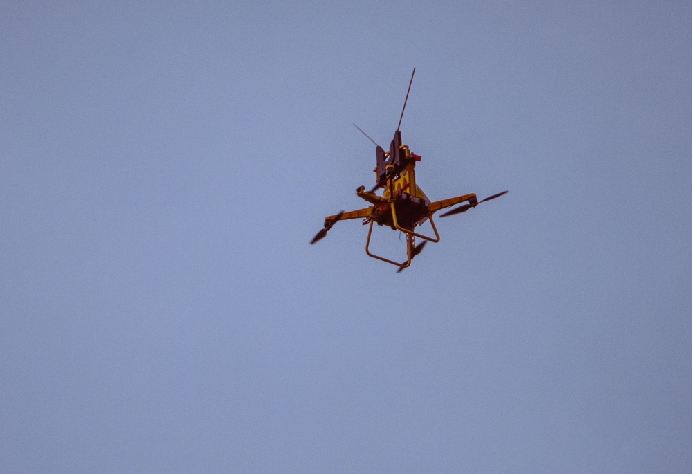 Specifically, the drone pilot will stand under the line to apply the diverters. The drone is equipped with five diverters and then flies into the air. It then attaches the diverters 10 metres apart to the line. Once the five diverters are installed, the drone lands so that it can pick up new diverters and continue the installation. In this way, more than a hundred diverters can be installed per day. All this is done with a drone that has been designed for this purpose. Electromagnetic fields produced by the high-voltage lines have little impact on the drone and it is specially equipped with tools to perform the various operations. During the installation, a technician integrates the GPS data of each of the diverters on the section.