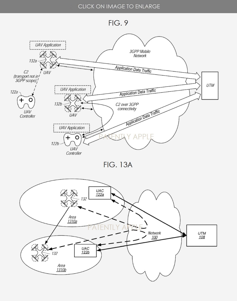 Apple’s patent FIG. 13A above illustrates an example of an Unmanned Traffic Management (UTM) system initiating handover of an unmanned aerial vehicle (UAV) from a first unmanned aerial controller (UAC) to a second UAC.