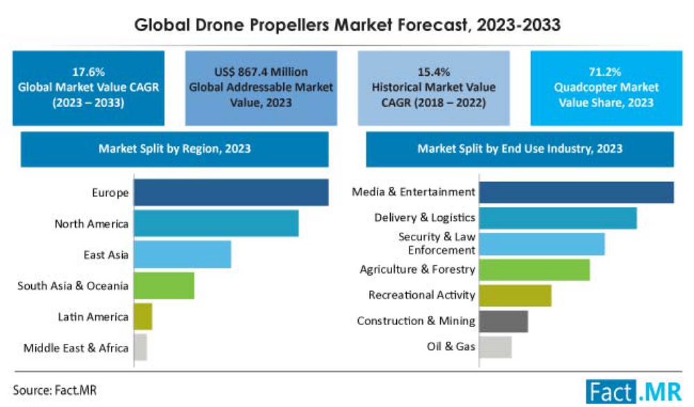 Market Research firm FACT MR has just published a study on the booming drone propellers market, which is estimated to reach valuation of US$ 867.4 million in 2023 and will top US$ 4,388.2 million by 2033, growing with a CAGR of around 17.6 % from 2023-2033.