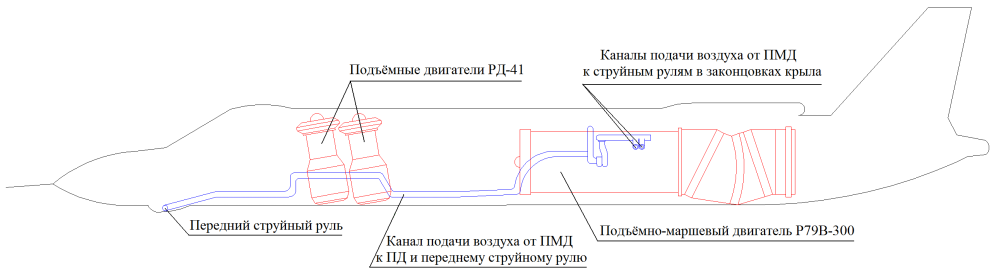 The top-mounted wing was similar to that of the Yakovlev Yak-36, though the outer panel swept back, and could be folded up for shipboard storage. The main engine was served by four side-mounted ducts as well as a row of large louvers along the upper surface to allow air to enter the engine during full power hovering. This engine was the R-79V-300, a two-shaft augmented turbofan with a bypass ratio of 1. Maximum thrust was 14,000 kg (30,864 lb). The rear nozzle could rotate from 0 degrees to 95 degrees for VTOL landing and hovering.