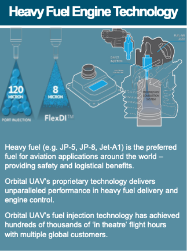 “The multi-fuel UAV engine incorporates Orbital UAV’s patented heavy fuel technology and will provide best in class performance to our customer.”