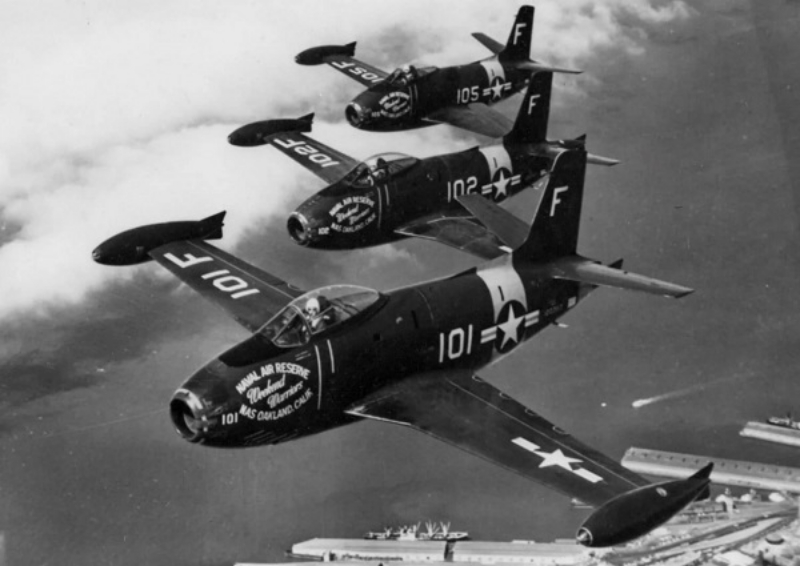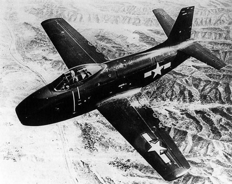 So it wasn’t until September 1946 that the XFJ-1 made its first flight, and deliveries of the production aircraft to the US Navy began in October 1947, with the FJ-1 only serving with a single squadron, VF-5A. With the FJ-1 this squadron was to be the first operational jet fighter squadron in the US Navy, landing aboard the USS Boxer in March 1948.