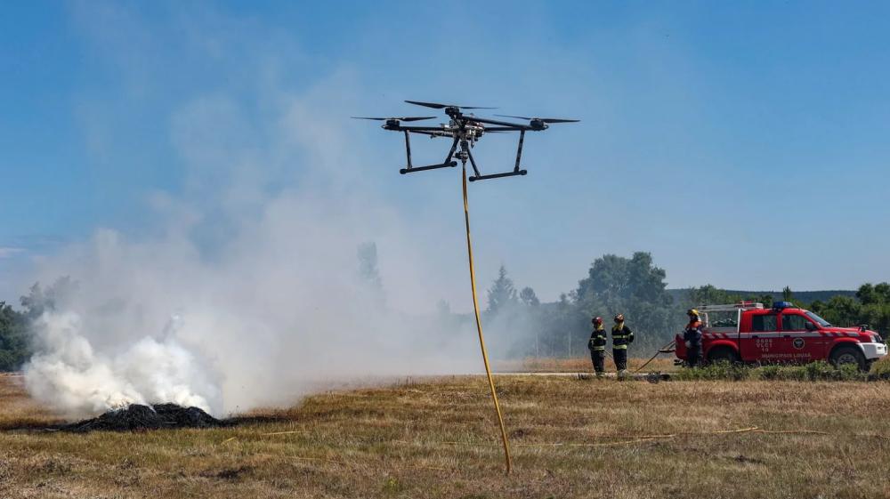 On a still, hot May afternoon in central Portugal, a car-sized pile of brush catches fire. As the flames leap higher, a torrent of water suddenly falls from the sky. It’s not rain, however. A large drone hovers about 15m (49ft) above, a fire-proof hose dangling from its belly.