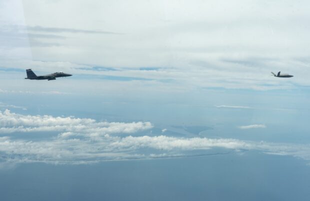Photo: An F-15E Strike Eagle from the 96th Test Wing’s 40th Flight Test Squadron at Eglin AFB, Florida flies in formation with an XQ-58A Valkyrie flown by artificial intelligence agents developed by the Autonomous Air Combat Operations, or AACO, team from AFRL. The algorithms matured during millions of hours in high fidelity AFSIM simulation events, 10 sorties on the X-62 VISTA, Hardware-in-the-Loop events with the XQ-58A, and ground test operations. – U.S. Air Force photo