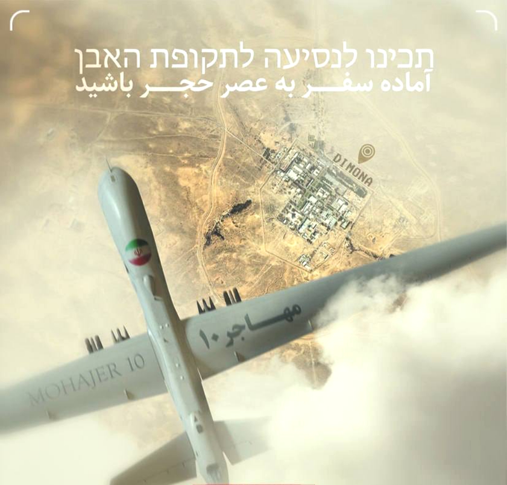 Iranian media on Tuesday also published a poster of the Mohajer-10, which depicted it flying in clouds overlooking the Dimona nuclear facilities in Israel with the words “Be ready to travel to the Stone Age”, written above it in Farsi and Hebrew.