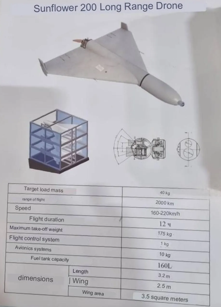 From the few details released, the Sunflower-200 is not a direct copy of the Shahed, but is something of an upgrade. It has similar performance, cruising at 160-220 km/h ( 100 – 135 mph) with a range variously given as 1500 or 2000 kilometers (around 900 – 1,250 miles) compared to 1,000 to 2,000 kilometres (about 600 – 1,250 miles) for the Iranian drone, and the 40-kilo/88-pound warhead is similar. Like the Shahed, the Sunflower can be launched with a rocket unit, and may also be capable of catapult launch. A handout at ARMY 2023 said the drones were fired from an eight-unit launcher, suggesting that it was meant for mass attacks.