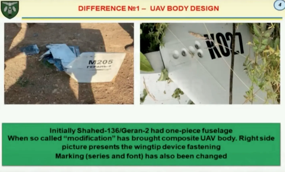 The new Shahed-136 drones have a composite body instead of a modular, one-piece fuselage, Ukraine says. (Ukrainian Military Media Center screencap)