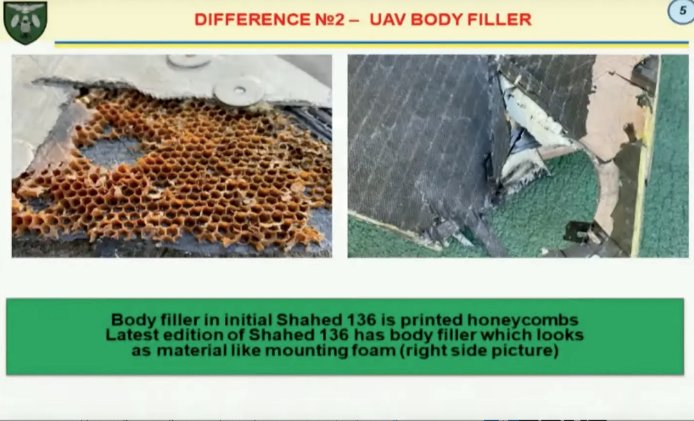 There has also been a redesign to drone bodies. The new Shahed drones have composite bodies filled with solid foam-like material as opposed to modular bodies with a honeycomb cell-like structure.
