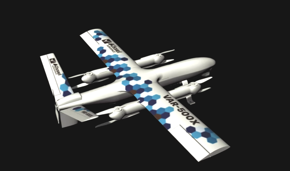 The high-performance medium-sized UAV VAR-500X, featuring IVIOS’s new product, is a vertical takeoff and landing (VTOL) medium-sized UAV capable of long-range operations. It has a wingspan of 3.9 meters, width of 5.0 meters, a maximum takeoff weight of 150 kilograms, and a top speed of 180 km/h. Based on these, it allows to perform versatile missions, including long-endurance flights, high-speed mobility, and long-range operations.
