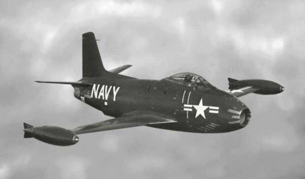 The wing, empennage, and canopy strongly resembled that of the piston-engined P-51D Mustang, North American Aviation’s highly successful World War II fighter, enclosing a relocated cockpit accommodation further forward in relation to the Mustang’s design, to ensure good forward pilot visibility for carrier operations.