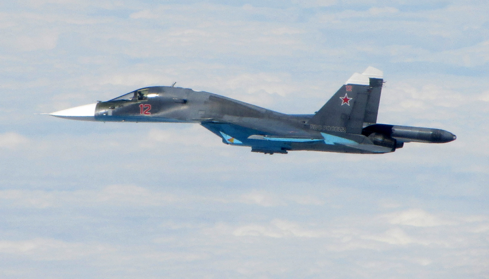 An air-to-air image taken over Baltic airspace by Typhoon air crew, intercepting a Russian Sukhoi Su-34 aircraft. As part of NATO’s ongoing mission to police Baltic airspace, RAF Typhoons intercepted 10 Russian aircraft during a single Baltic Air Patrol, QRA (Quick Reaction Alert) mission 2015