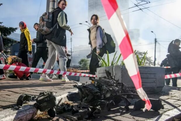 Photo: Local residents look at parts of an unmanned aerial vehicle after a Russian drone strike in Kyiv, Ukraine on Oct. 17, 2022. (Vladyslav Musiienko/Reuters)