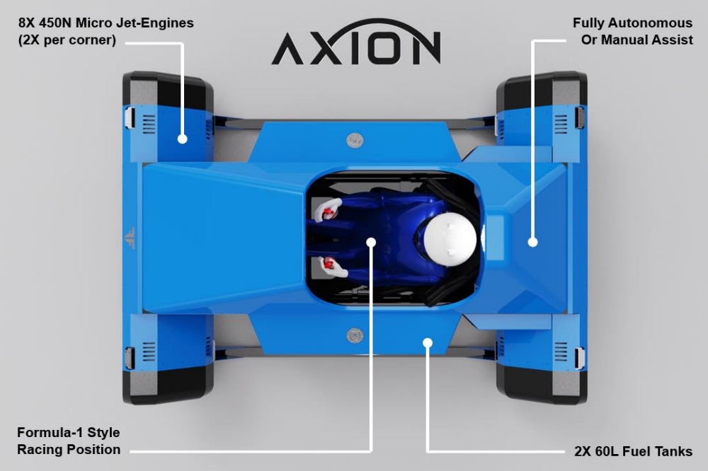 The jet-engines of the Axion consume a variety of heavy-fuels ranging from gas-station Diesel to Biodiesel to Jet-A making it easy to refuel the vehicle almost anywhere in the world. Furthermore, it only takes a few minutes to refill the 30-gallon fuel tank as opposed to the several hours it takes to recharge an electrical aerial transport.