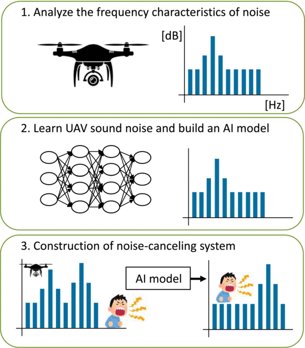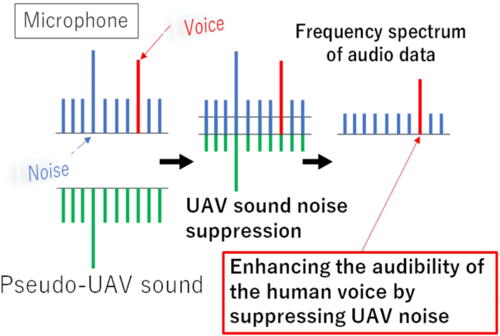 At the heart of this novel system is an advanced AI model, known as Generative Adversarial Networks (GANs), which can accurately learn various types of data. It was used to learn the various types of UAV propeller sound data. This learned model is then used to generate a similar sound to that of the UAV propellers, called pseudo-UAV sound. This pseudo-UAV sound is then subtracted from the actual sound captured by the onboard microphones in the UAV, allowing the operator to clearly hear and therefore recognize human sounds.