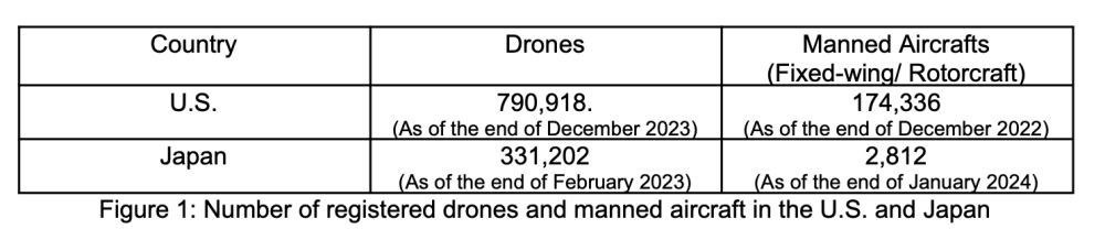 Based on FAA figures, there are currently about 2.4 times as many registered drones and 62 times as many registered manned aircraft in the U.S. than in Japan, with the expectations of further growth within the next four years.