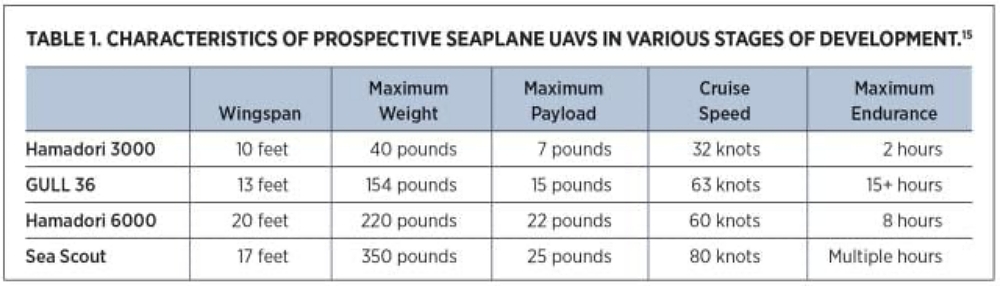 The aircraft typically weigh 150 to 450 pounds each—squarely inside the Department of Defense’s midtier UAS Group 3 category. They can be launched or recovered in moderately high sea states and remain aloft for multiple hours. Speed is not vital, with most cruising at less than 100 knots. Endurance is the key consideration, varying from as little as 2 hours to as many as 15. Thanks to their small size, many seaplane uncrewed aerial vehicles (UAVs) have modest fuel requirements, improving costs and reducing logistical burdens. The ongoing development of hydrogen fuel cells and battery technologies could further improve both.