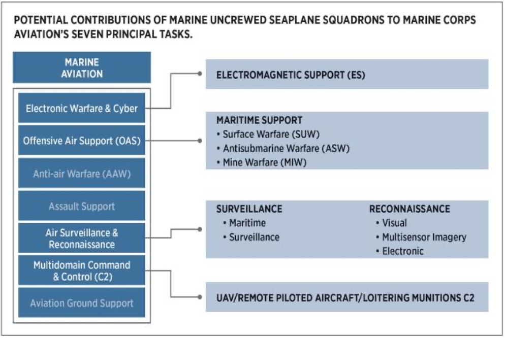 The Marine Corps should build uncrewed seaplane squadrons to support Marine littoral regiments (MLRs). Broken into sea-mobile detachments, the squadrons would contribute across the spectrum of competition: providing maritime surveillance to joint and allied forces while campaigning, holding contact on adversary naval forces in the deterrence phase, and supporting multiple kill chains in conflict. Thanks to small size and low costs, their ability to operate from thousands of miles of coastline would provide a flexible, mobile, persistent, and cost-effective platform for the stand-in force.