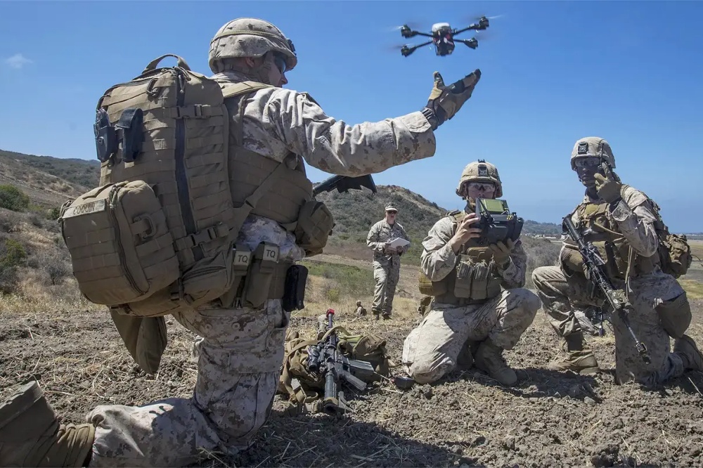 A Marine launches a small quadcopter-type drone during training. USMC