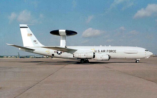 The E-3 Sentry is a modified Boeing 707/320 commercial airframe with a rotating radar dome. The dome is 30 feet (9.1 meters) in diameter, six feet (1.8 meters) thick, and is held 11 feet (3.33 meters) above the fuselage by two struts. It contains a radar subsystem that permits surveillance from the Earth’s surface up into the stratosphere, over land or water. The radar has a range of more than 250 miles (375.5 kilometers). The radar combined with an identification friend or foe, or IFF, subsystem can look down to detect, identify and track enemy and friendly low-flying aircraft by eliminating ground clutter returns that confuse other radar systems.