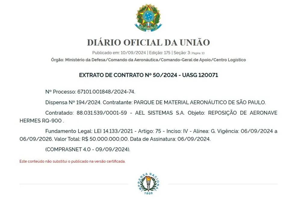 On September 10th, Brazil’s Ministry of Defense published in the Official Gazette of the Union the Contract Extract No. 50/2024, regarding the replacement of a medium-altitude, long-endurance (MALE) Elbit Hermes 900 (RQ-900) drone for the Brazilian Air Force (FAB).