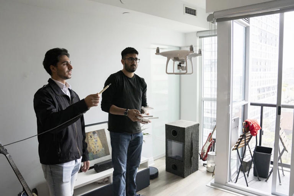 The pair enlisted Asad Ishaq, a robotics student, who unscrewed two “tweeter” speakers from his car. Tweeters produce higher-pitch sounds, which the team blasted at drone components in Mahendru’s living room. An electrical engineer, Michael Acquaviva, joined to build the device’s circuitry.