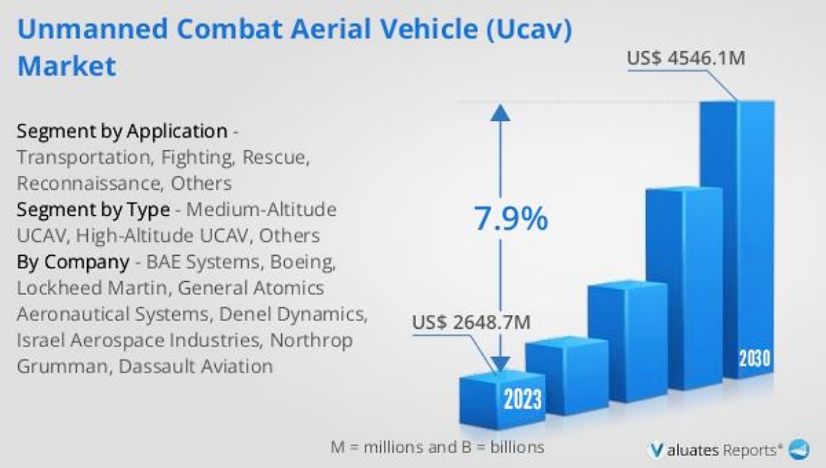 The global Unmanned Combat Aerial Vehicle (UCAV) Market was valued at USD 2648.7 Million in 2023 and is anticipated to reach USD 4546.1 Million by 2030, witnessing a CAGR of 7.9% during the forecast period 2024-2030.