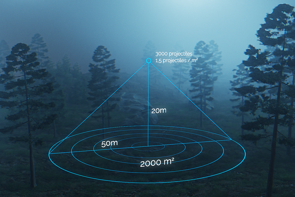• Coming from above, the explosive effect can be freely adjusted according to the altitude of the drone; it has an opening angle of 90 degrees