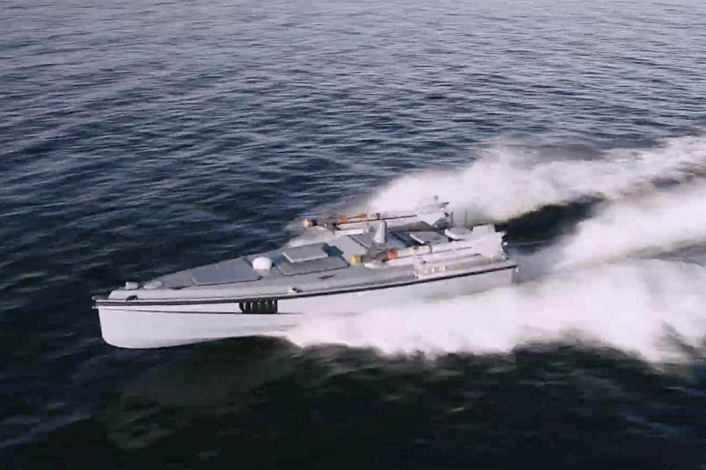 Magura V7 surface drone (USV) armed with two Sidewinder missiles. Note that the missiles have yellow protective covers over their seekers, indicating that it is on a test run.