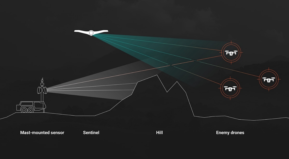 Sentinel can detect low-flying drones that exploit terrain to mask their presence from ground-based C-UAS sensors. Having eyes in the sky means Sentinel’s line of sight is not obstructed by geographic or man-made obstacles, enabling early warning and interception.