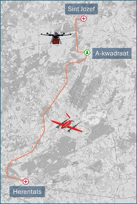For the first stage of the project Skyports will be flying the RigiTech Eiger and the Speedbird DLV-2. The Eiger will be used to fly the A-kwadraat to AZ Herentals route, covering the 18.7km distance in 13 minutes (compared to 30 mins by road), flying with an average cruise speed of 29 m/s with a nominal operating altitude of 80m, with a max payload of 3kg. The DLV-2 will fly the A-kwadraat to St Jozef route, covering the 4.4km distance in 7 minutes (compared to 16 mins by road), flying with an average cruise speed of 16 m/s with a nominal operating altitude of 50m, with a max payload of 5kg.